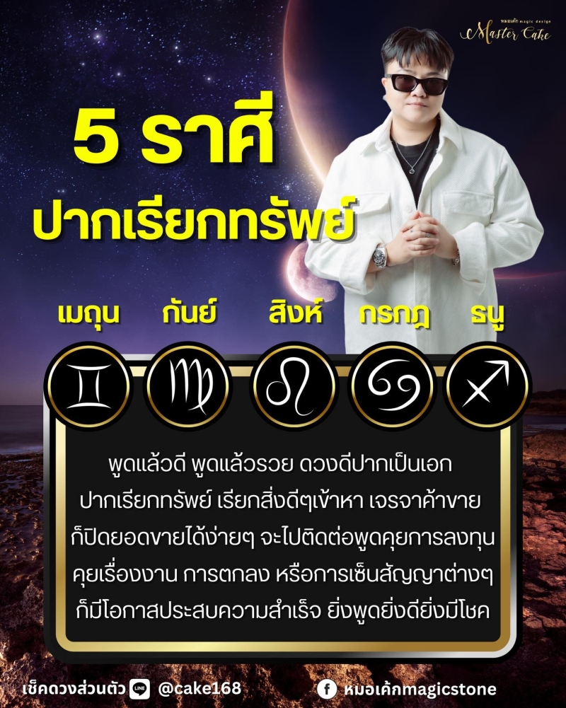 หมอเค้กMagic stone เผยถึงดวงราศี ปากเรียกทรัพย์ พูดแล้วดี พูดแล้วรวย ดวงดีปากเป็นเอก ปากเรียกทรัพย์ เรียกสิ่งดีๆ เข้าหา เจรจาค้าขาย ก็ปิดยอดขายได้ง่ายๆ จะไปติดต่อพูดคุยการลงทุน คุยเรื่องงาน การตกลง หรือเซ็นสัญญาต่างๆ ก็มีโอกาสประสบความสำเร็จ ยิ่งพูดยิ่งดียิ่งมีโชค