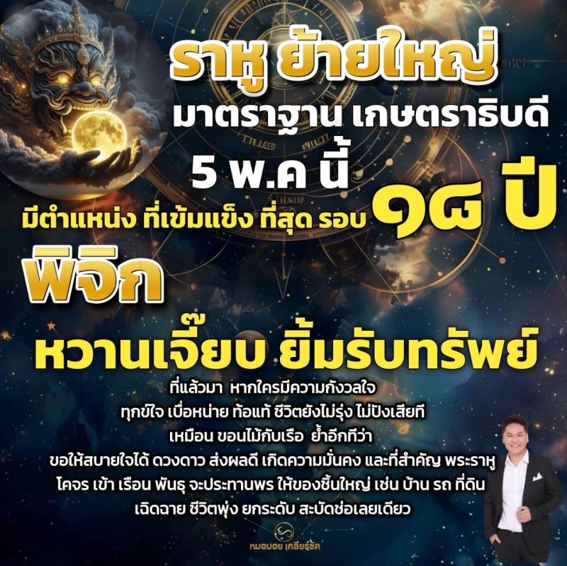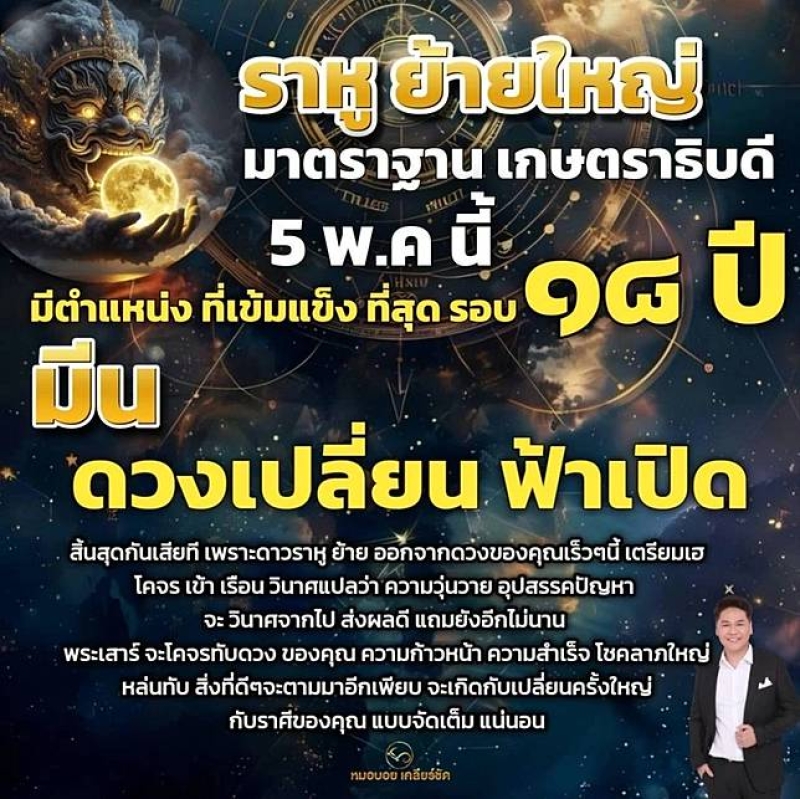 หมอบอย เคลียร์ชัด ทำนายดวงผ่านทางเฟซบุ๊คส่วนตัว หมอบอย เคลียร์ชัด เผยราหูย้ายใหญ่ มาตราฐานเกษตราธิบดี 5 พ.ค. นี้ มีตำแหน่งที่เข้มแข็งที่สุดรอบ 18 ปี พบ 2 ราศี ดวงเปลี่ยน ฟ้าเปิด ยิ้มรับทรัพย์ โชคลาภใหญ่หล่นทับ ได้เเก่ ราศีมีน,ราศีพิจิก