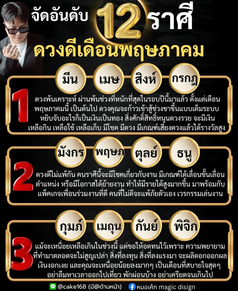 วันที่ 25 เม.ษ. 68 ทาง หมอเค้กMagicdesign เผยถึงการจัดอันดับ 12 ราศี ดวงดีในเดือนพฤษภาคม มีราศีที่ก้าวเข้าสู่ช่วงขาขึ้นแบบเต็มระบบ เป็นเดือนที่สบายใจสุดๆ