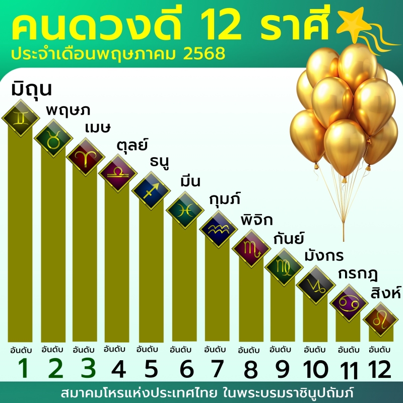 วันที่ 4 พ.ค. 68 ทางสมาคมโหรแห่งประเทศไทย ในพระบรมราชินูปถัมภ์ จัดอันดับคนดวงดี 12 ราศี ประจำเดือนพฤษภาคม 2568 ราศีไหนจะมีดวงโดดเด่นมากที่สุด มาดูดวงกันเลย