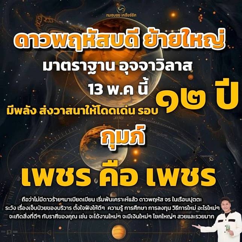 หมอบอย เคลียร์ชัด นักพยากรณ์ชื่อดัง ล่าสุดได้ออกมาทำนาย 1 ราศี เริ่มพ้นเคราะห์ มีเกณฑ์จะได้งานใหม่ เงินใหม่ โชคใหญ่ หลัง ดาวพฤหัสย้าย 13 พฤษภาคม 2568 เป็นปรากฏการณ์ทางโหราศาสตร์ โดยเผยผ่านเฟซบุ๊ค หมอบอย เคลียร์ชัด ระบุว่า ดาวพฤหัสบดีย้ายใหญ่ มาตราฐานอุจจาวิลาส 13 พ.ค. นี้ มีพลัง ส่งวาสนาให้โดดเด่นรอบ 12 ปี