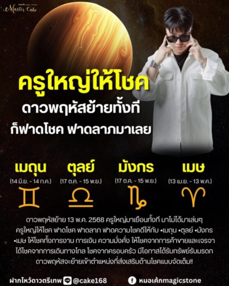 วันที่ 10 เม.ษ. 68 ที่ผ่านมา ทางหมอเค้กMagicdesign เผยถึง 4 ราศี ครูใหญ่ให้โชค ดาวพฤหัสย้ายทั้งที ก็ฟาดโชค ฟาดลาภมาให้ 4 ราศี ดาวพฤหัสย้าย 13 พ.ค.2568 ครูใหญ่มาเยือนทั้งที ไม่ได้มาเล่นๆ ครูใหญ่ให้โชค ฟาดโชค ฟาดลาภ ฟาดความโชคดีให้กับ 4 ราศี ให้โชคทั้งการงาน การเงิน ความมั่งคั่ง ให้โชคจากการค้าขายและเจรจา