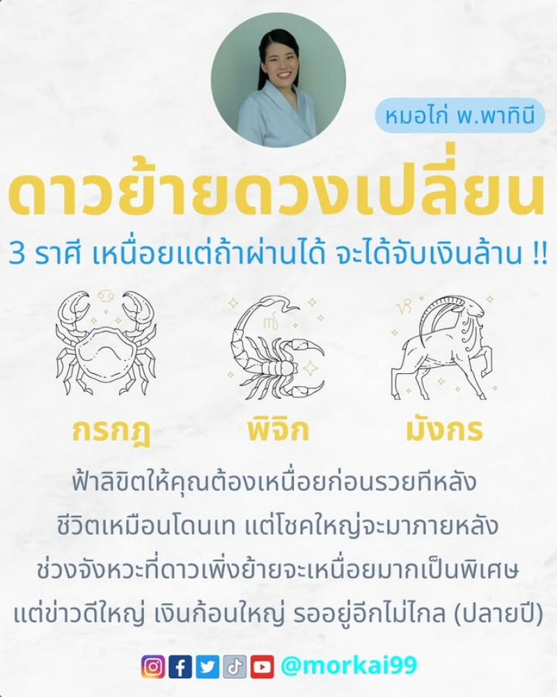 ล่าสุดทางด้านนักพยากรณ์ดังอย่าง หมอไก่ พ.พาทินี ได้ทำนายดวง 3 ราศี ดาวย้ายดวงเปลี่ยน เหนื่อยแต่ถ้าผ่านได้ จะได้จับเงินล้าน ผ่านอินสตาแกรม morkai99 ระบุว่า ดาวย้ายดวงเปลี่ยน 3 ราศี เหนื่อยแต่ถ้าผ่านได้ จะได้จับเงินล้าน