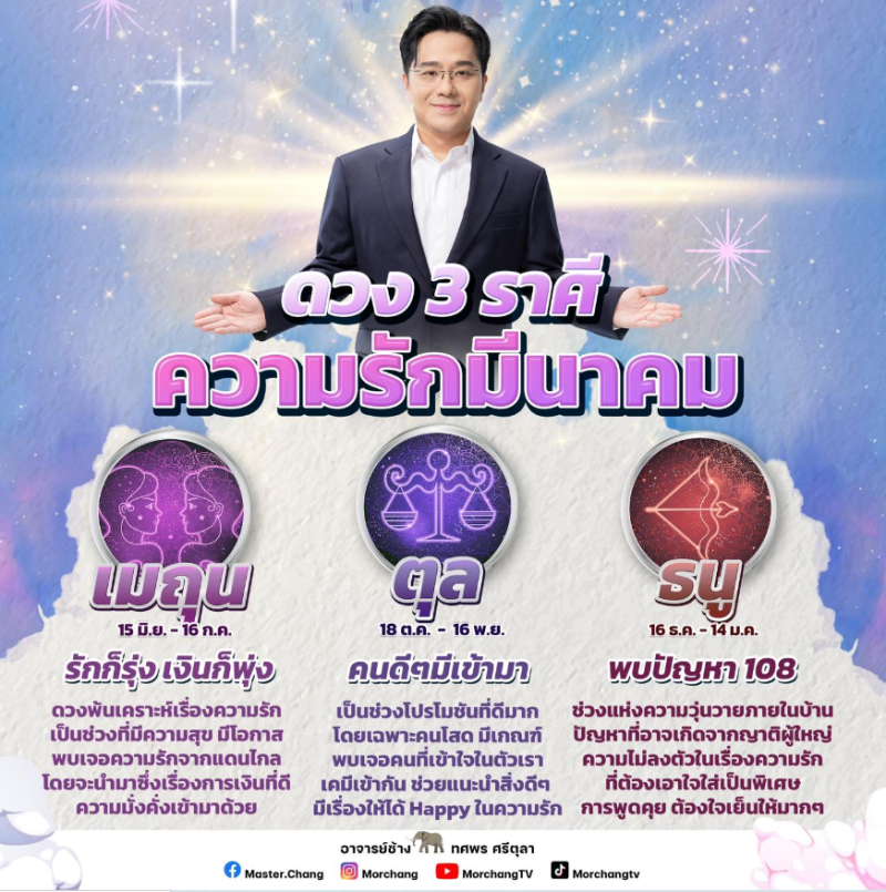วันที่ 13 มี.ค. 67 ที่ผ่านมา หมอช้าง ทศพร ศรีตุลา หมอดูชื่อดัง ได้เผยคำทำนาย 3 ราศี ดวงความรักเดือนมีนาคมเป็นอย่างไร