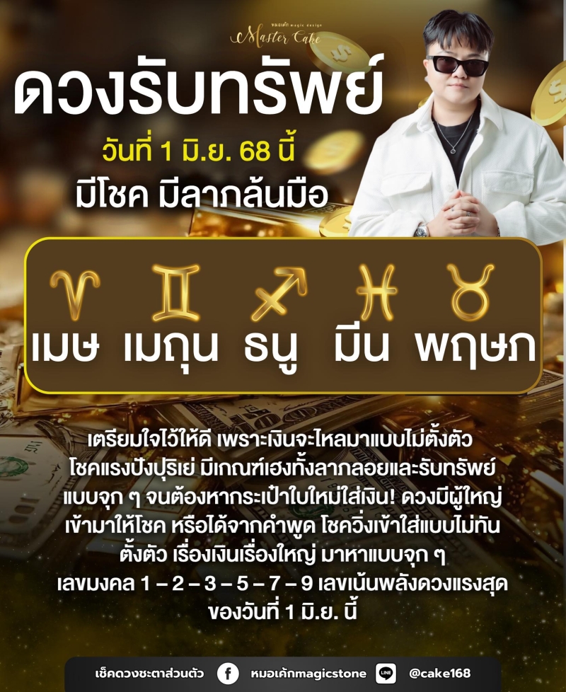 วันที่ 27 พ.ค. 68 ทาง หมอเค้กMagic stone เปิด 5 ราศี ดวงเรียกทรัพย์รับทรัพย์ ในวันที่ 1 มิถุนายน 2568 นี้ มีโชค มีลาภล้นมือ เตรียมใจไว้ให้ดี เพราะเงินจะไหลมาแบบไม่ตั้งตัว โชคแรงปังปุริเย่ มีเกณฑ์เฮงทั้งลาภลอยและรับทรัพย์ แบบจุก ๆ จนต้องหากระเป๋าใบใหม่ใส่เงิน! ดวงมีผู้ใหญ่ เข้ามาให้โชค หรือได้จากคําพูด โชควิ่งเข้าใส่แบบไม่ทัน ตั้งตัว เรื่องเงินเรื่องใหญ่ มาหาแบบจุกๆ