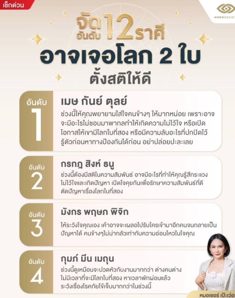 1. เมษ กันย์ ตุลย์ ช่วงนี้ให้คุณพยายามใส่ใจคนข้าง ๆ ให้มากหน่อย เพราะอาจจะมีอะไรไม่ชอบมาพากลทำให้เกิดความไม่ไว้ใจ หรือเปิดโอกาสให้เขามีโลกใบที่สอง หรือมีความลับอะไรที่ปกปิดไว้ รู้ตัวก่อนหาทางป้องกันได้ก่อน อย่าปล่อยปะละเลย