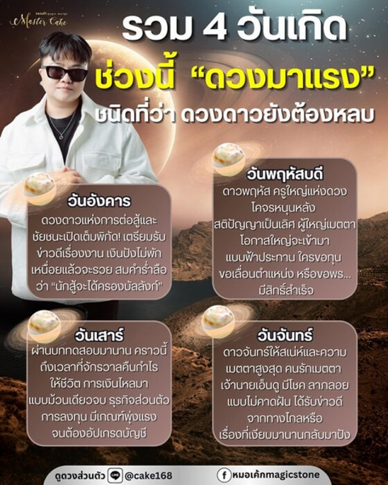 หมอเค้ก Magic stone เปิดชะตา 4 วันเกิด ช่วงนี้ “ดวงมาแรง” ชนิดที่ว่า ดวงดาวยังต้องหลบ เผย มีโอกาสใหญ่เข้ามา เตรียมรับข่าวดีเรื่องงาน เงินปังไม่พัก โดยมีรายละเอียดของแต่ละวันเกิดดังนี้