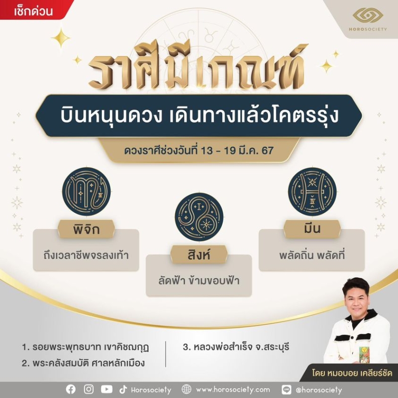 เมื่อวันที่ 14 มี.ค. 67 ที่ผ่านมา ทางเพจ Horosociety หมอบอย เคลียร์ชัด นักดูดวงและราศี โดยได้ทำนายดวง 3 ราศี ช่วงนี้มีทริปไปมูต่างประเทศ ต่างจังหวัดแล้วจะเฮงปัง มาดูกัน