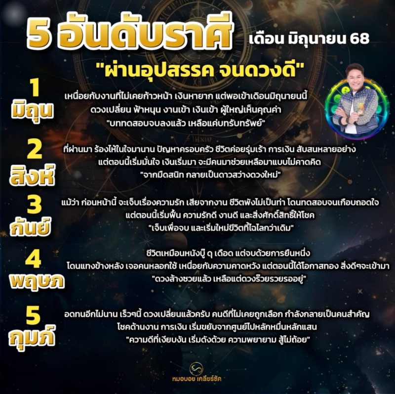 วันที่ 8 มิ.ย. 68 ที่ผ่านมา หมอบอย หมอดูชื่อดัง เปิด 5 อันดับราศี เดือนมิถุนายน 2568 เตรียมเปิดทางใหม่ให้ตัวเองได้เลย..ฟ้ารู้ว่าคุณสู้ เทพรู้ว่าคุณทน และถึงเวลาที่จักรวาลจะตอบแทนแล้ว