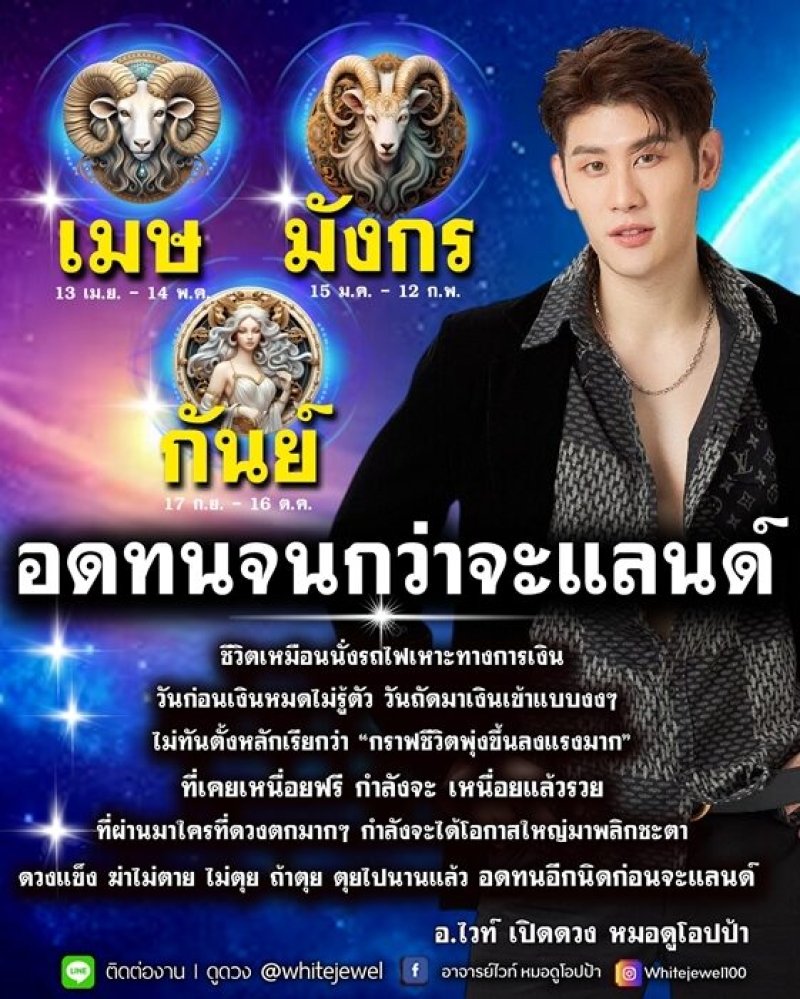 วันที่ 9 มิ.ย. 68 อ.ไวท์ หมอดูโอปป้า เปิดชะตา 3 ราศี อดทนจนกว่าจะแลนด์ เผย ชีวิตเหมือนนั่งรถไฟเหาะทางการเงิน กราฟชีวิตพุ่งขึ้นลงแรงมาก กำลังจะได้โอกาสใหญ่มาพลิกชะตา ประกอบด้วย ราศีเมษ ราศีมังกร และ ราศีกันย์ โดยมีรายละเอียดดังนี้