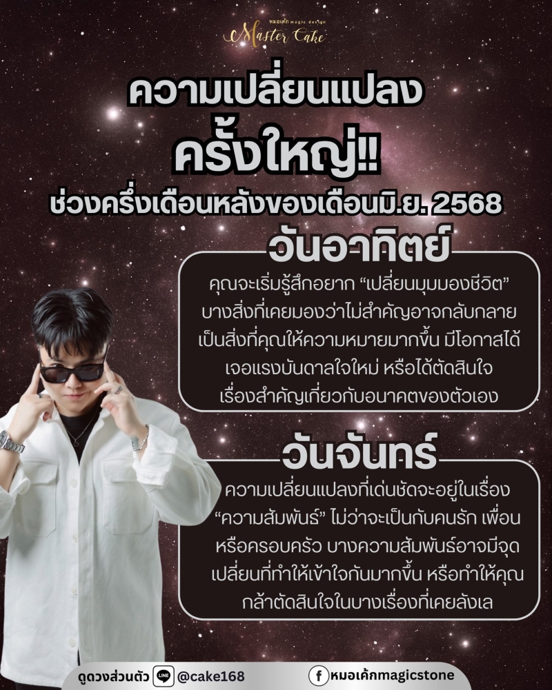 วันที่ 10 มิ.ย. 68 หมอเค้กMagic stone เผยถึงดวงชะตาที่จะมีความเปลี่ยนแปลงครั้งใหญ่ ช่วงครึ่งเดือนหลังของเดือนมิ.ย.2568 ทั้งเปลี่ยนมุมมองชีวิต บางสิ่งที่เคยมองว่าไม่สำคัญอาจกลับกลายเป็นสิ่งที่คุณให้ความหมายมากขึ้น มีโอกาสได้เจอแรงบันดาลใจใหม่ หรือได้ตัดสินใจเรื่องสำคัญเกี่ยวกับอนาคตของตัวเอง