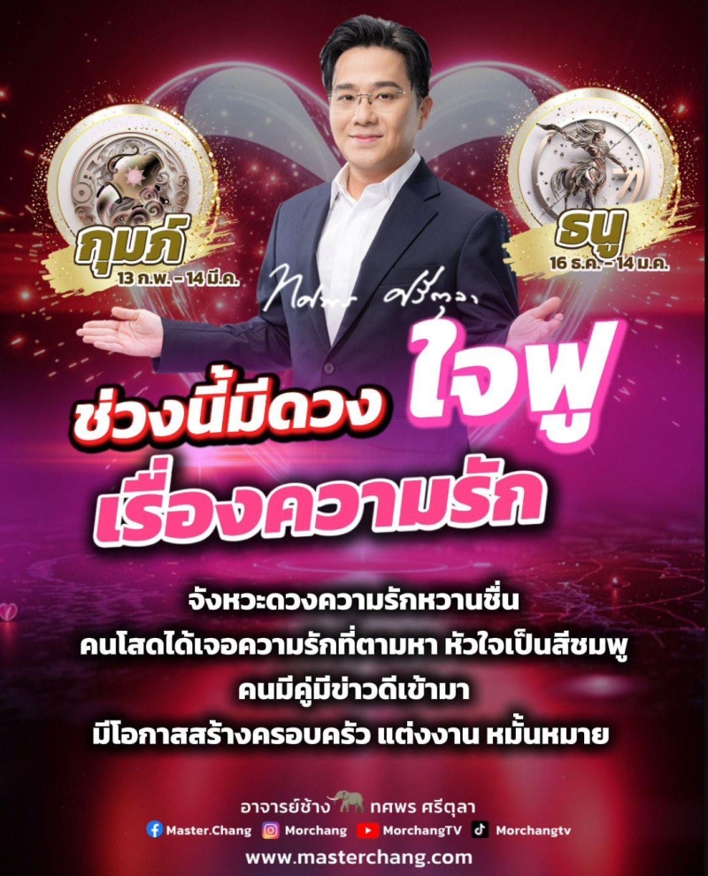 เมื่อวันที่ 11 มิ.ย. 68 ทางหมอช้าง ทศพร ศรีตุลา นักพยากรณ์ชื่อดัง ที่ล่าสุด ได้โพสต์เฟซบุ๊กเผยคำทำนายดวงความรักของ 2 ราศี ที่ในช่วงนี้มีดวงใจฟูเรื่องความรักเป็นพิเศษ ได้แก่ราศีกุมภ์ และราศีธนู โดยมีคำทำนาย ดังนี้