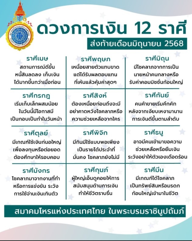 วันที่ 20 มิ.ย.68 ทาง สมาคมโหรแห่งประเทศไทย ในพระบรมราชินูปถัมภ์ เผยดวงการเงิน 12 ราศี ส่งท้ายเดือนมิ.ย.68 สถานการณ์ดีขึ้น หนี้สินลดลง เก็บเงินได้มากขึ้นกว่าเมื่อก่อน เหนื่อยสายตัวแทบขาด แต่ได้รับผลตอบแทนที่เห็นแล้วคุ้มค่าสุดๆ มีโชคลาภจากการเป็นนายหน้าคนกลาง หรือรับค่าคอมมิชชั่นก้อนใหญ่