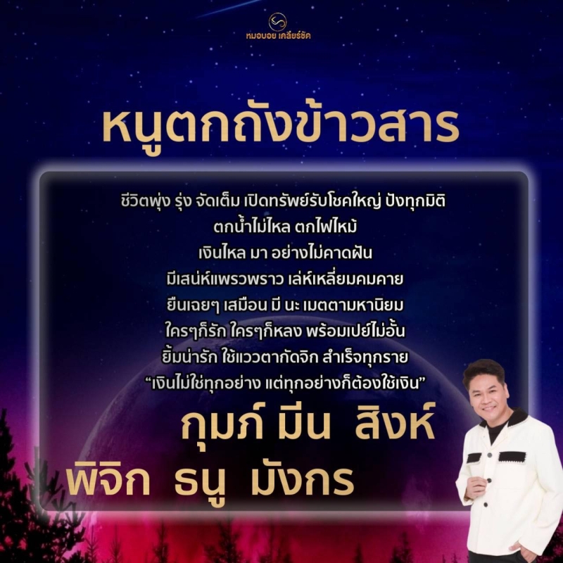 เงินไหลมา อย่างไม่คาดฝัน มีเสน่ห์แพรวพราว เล่ห์เหลี่ยมคมคาย ยืนเฉยๆ เสมือน มีนะเมตตามหานิยม ใครๆก็รัก ใครๆก็หลง พร้อมเปย์ไม่อั้น ยิ้มน่ารัก ใช้แววตากัดจิก สำเร็จทุกราย เงินไม่ใช่ทุกอย่าง แต่ทุกอย่างก็ต้องใช้เงิน กุมภ์ มีน สิงห์ พิจิก ธนู มังกร