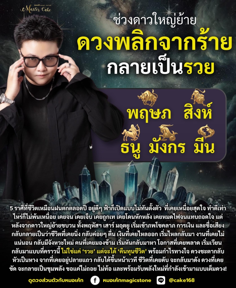 วันที่ 24 มิ.ย. 68 หมอเค้ก Magic stone เผย ช่วงที่ดาวใหญ่ย้าย ดวงทั้ง 5 ราศี จะเปลี่ยนจากร้ายให้กลายเป็นรวย ฟ้าเปิดทางให้ หายเหนื่อยสักที ได้แก่ราศี พฤษภ สิงห์ ธนู มังกร มีน