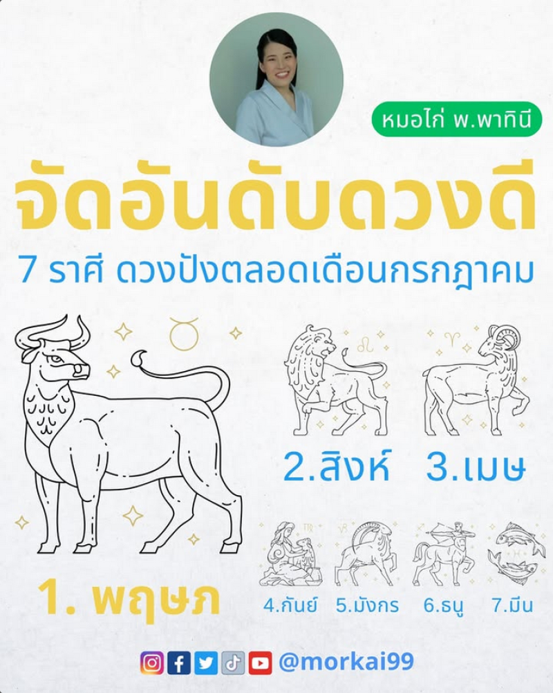 เป็นอีกหนึ่งนักพยากรณ์สาวชื่อดังอย่าง หมอไก่ พ.พาทินี ที่ล่าสุดได้จัดอันดับดวงดี 7 ราศีเด่น ประจำเดือนกรกฎาคม ผ่านทางอินสตาแกรม morkai99ได้ทำนายดวงระบุว่า จัดอันดับดวงดี 7 ราศี ดวงปังตลอดเดือนกรกฎาคม ได้แก่