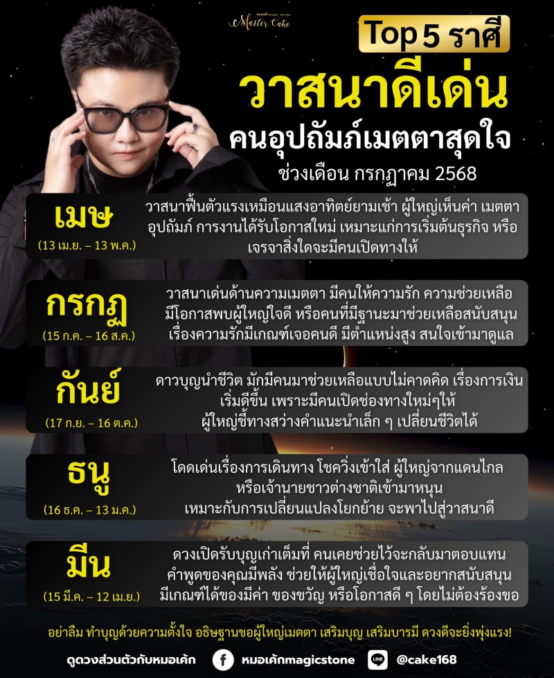 วันที่ 27 มิ.ย. 68 ทางเพจหมอเค้กMagic stone ได้ออกมาเผยว่า Top5 ราศี วาสนาดีเลิสที่สุดเลยแหละ ช่วงนี้คนดวงอุปถัมภ์แรงที่สุด