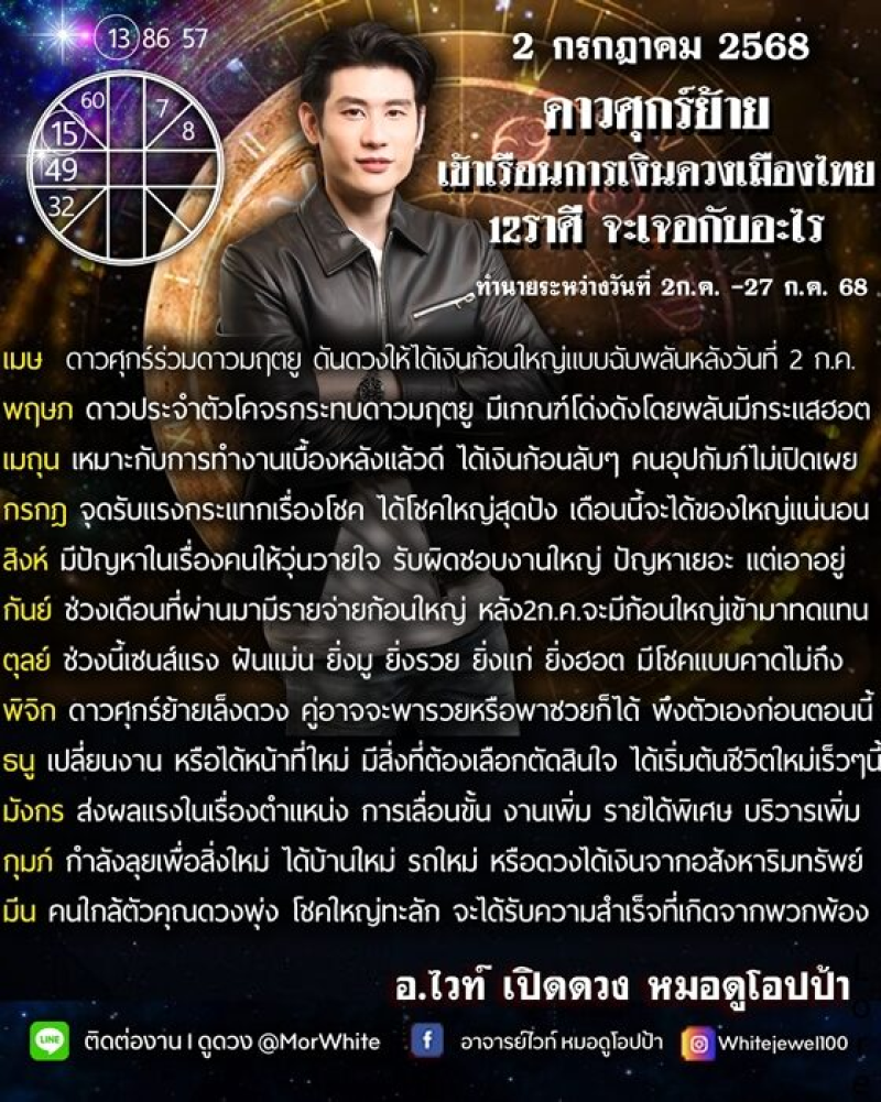 อ.ไวท์ หมอดูโอปป้า เผย 2 กรกฎาคม 2568 ดาวศุกร์ย้าย เข้าเรือนการเงินดวงเมืองไทย 12 ราศี จะเจอกับอะไร ระหว่างวันที่ 2-27 ก.ค. 68 ทำนายราศีใดได้เงินก้อนใหญ่ ได้โชคใหญ่สุดปัง โดยมีรายละเอียดดังนี้