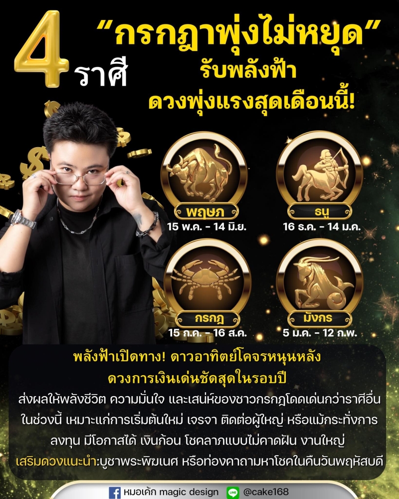วันที่ 2 ก.ค. 68 ทาง หมอเค้กMagicdesign เผยถึงดวงชะตาราศี กรกฎาคมพุ่งไม่หยุด รับพลังฟ้า ดวงพุ่งแรงสุดเดือนนี้ พลังฟ้าเปิดทาง ดาวอาทิตย์โคจรหนุนหลัง ดวงการเงินเด่นชัดสุดในรอบปี ส่งผลให้พลังชีวิต ความมั่นใจและเสน่ห์ราศีนี้โดดเด่นกว่าราศีอื่น ในช่วงนี้เหมาะแก่การเริ่มต้นใหม่ เจรจา ติดต่อผู้ใหญ่ หรือแม้กระทั่งการลงทุน มีโอกาสได้เงินก้อน โชคลาภแบบไม่คาดฝัน งานใหญ่
