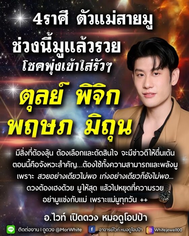 วันที่ 8 ก.ค.68 อ.ไวท์ หมอดูโอปป้า เปิดดวงชะตา 4 ราศี ตัวแม่สายมู ช่วงนี้มูแล้วรวย โชคพุ่งเข้าใส่ จะมีข่าวดีให้ตื่นเต้น ตอนนี้คือจังหวะสำคัญ ประกอบด้วย ราศีตุลย์ ราศีพิจิก ราศีพฤษภ และ ราศีมิถุน โดยมีรายละเอียดดังนี้