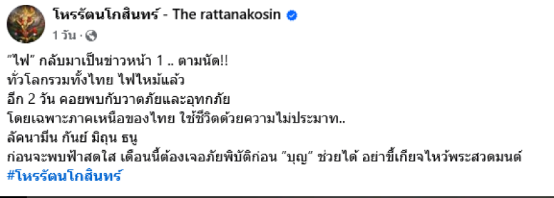 ล่าสุดทางด้านโหรรัตนโกสินทร์ ได้เตือน 4ลัคนา มีเรื่องต้องระวัง ผ่านทางเฟซบุ๊คโหรรัตนโกสินทร์ - The rattanakosin ระบุว่า ไฟกลับมาเป็นข่าวหน้า 1 ตามนัด ทั่วโลกรวมทั้งไทย ไฟไหม้แล้ว อีก 2 วัน คอยพบกับวาตภัยและอุทกภัย