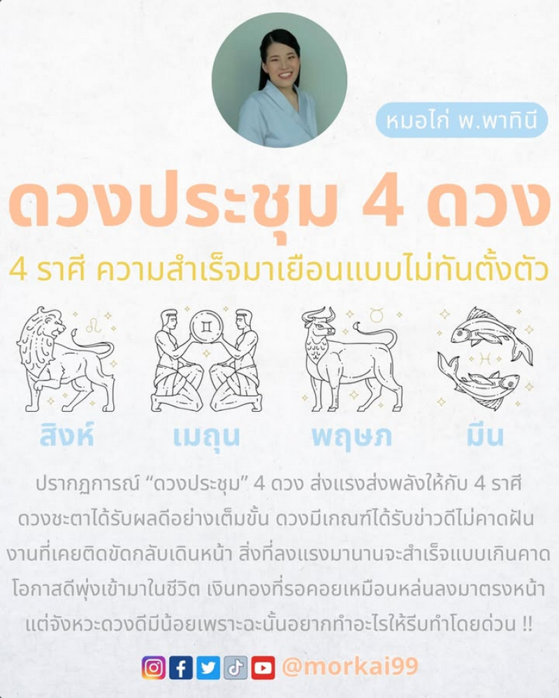 นักพยากรณ์ชื่อดังอย่าง หมอไก่ พ.พาทินี ได้ทำนายดวง เมื่อดาวประชุมรวมตัว 4 ดวง คนเกิด 4 ราศี โอกาสดีเข้ามาแบบไม่ทันตั้งตัว เตรียมเฉิดฉายสุดๆในช่วงนี้ ผ่านอินสตาแกรม @morkai99 ระบุว่า ปรากฎการณ์ ดาวประชุม 4 ดวง ส่งแรงส่งพลังให้กับ 4 ราศี