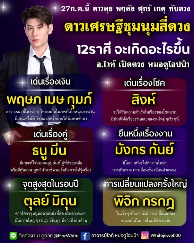 วันที่ 26 ก.ค. ทางอ.ไวท์ หมอดูโอปป้า เผย 27 ก.ค.นี้ ดาวพุธ พฤหัส ศุกร์ เกตุ ทับดวง ดาวเศรษฐีชุมนุมสี่ดวง เผย 12 ราศี จะเกิดอะไรขึ้น ราศีใดเด่นเรื่องเงิน ราศีใดเด่นเรื่องโชค โดยมีรายละเอียดของแต่ละราศีดังนี้