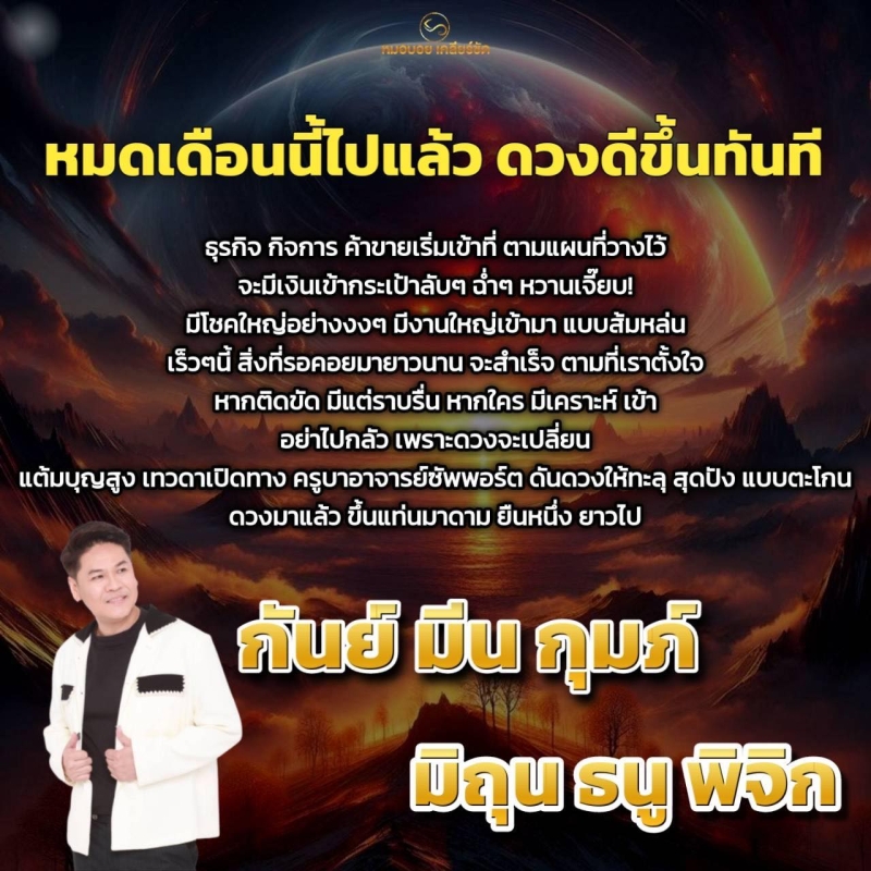 ล่าสุดทางด้านนักพยากรณ์ชื่อดังอย่าง หมอบอย เคลียร์ชัด ได้ออกมาทำนายดวง 6 ราศี ผ่านเฟซบุ๊คหมอบอย เคลียร์ชัดระบุว่า 6 ราศี หมดเดือนนี้ไปแล้ว ดวงดีขึ้นทันที ธุรกิจ กิจการ ค้าขายเริ่มเข้าที่ตามแผนที่วางไว้ จะมีเงินเข้ากระเป๋าลับๆฉ่ำ มีโชคใหญ่อย่าง งงๆ มีงานใหญ่เข้ามาแบบส้มหล่น เร็วๆนี้ สิ่งที่รอคอยมานานจะสำเร็จตามที่เราตั้งใจ