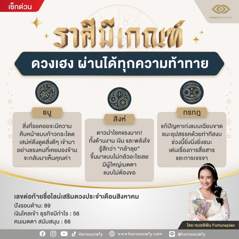 วันที่ 6 ส.ค. 68 ทางเพจ Horosociety หมอพิพิม Fortuneplan เปิด 3 ราศี ดวงเฮง ผ่านได้ทุกความท้าทาย ได้แก่ ธนู สิงห์ กรกฏ