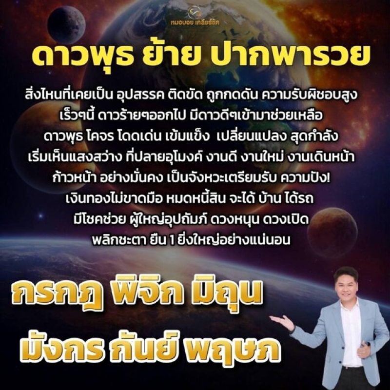 สิ่งไหนที่เคยเป็นอุปสรรค ติดขัด ถูกกดดัน ความรับผิดชอบสูง เร็ว ๆ นี้ ดาวร้าย ๆ ออกไป มีดาวดี ๆ เข้ามาช่วยเหลือ ดาวพุธ โคจร โดดเด่น เข้มแข็ง เปลี่ยนแปลง สุดกำลัง เริ่มเห็นแสงสว่างที่ปลายอุโมงค์ งานดี งานใหม่ งานเดินหน้าก้าวหน้าอย่างมั่นคง เป็นจังหวะเตรียมรับความปัง เงินทองไม่ขาดมือ หมดหนี้สิน จะได้บ้าน ได้รถ มีโชคช่วย ผู้ใหญ่อุปถัมภ์ ดวงหนุน ดวงเปิด พลิกชะตายืน 1 ยิ่งใหญ่อย่างแน่นอน