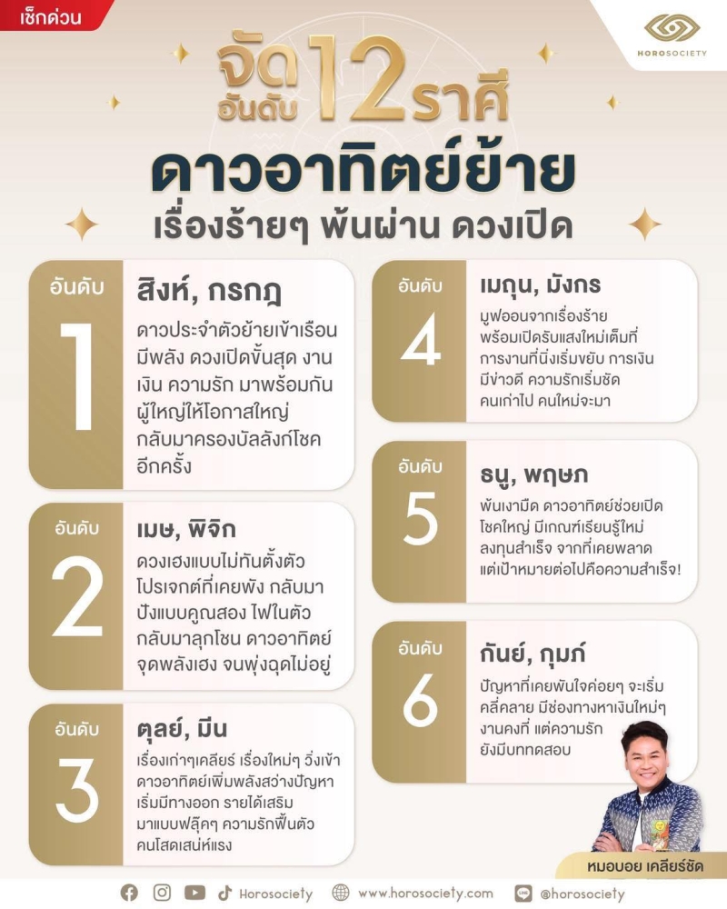 วันที่ 10 ส.ค. 68 ทาง หมอบอย เคลียร์ชัด จัดอันดับ 12 ราศี ถึงเวลาดีดวงเปิด รับทรัพย์ รับโชครับดาวอาทิตย์ย้าย