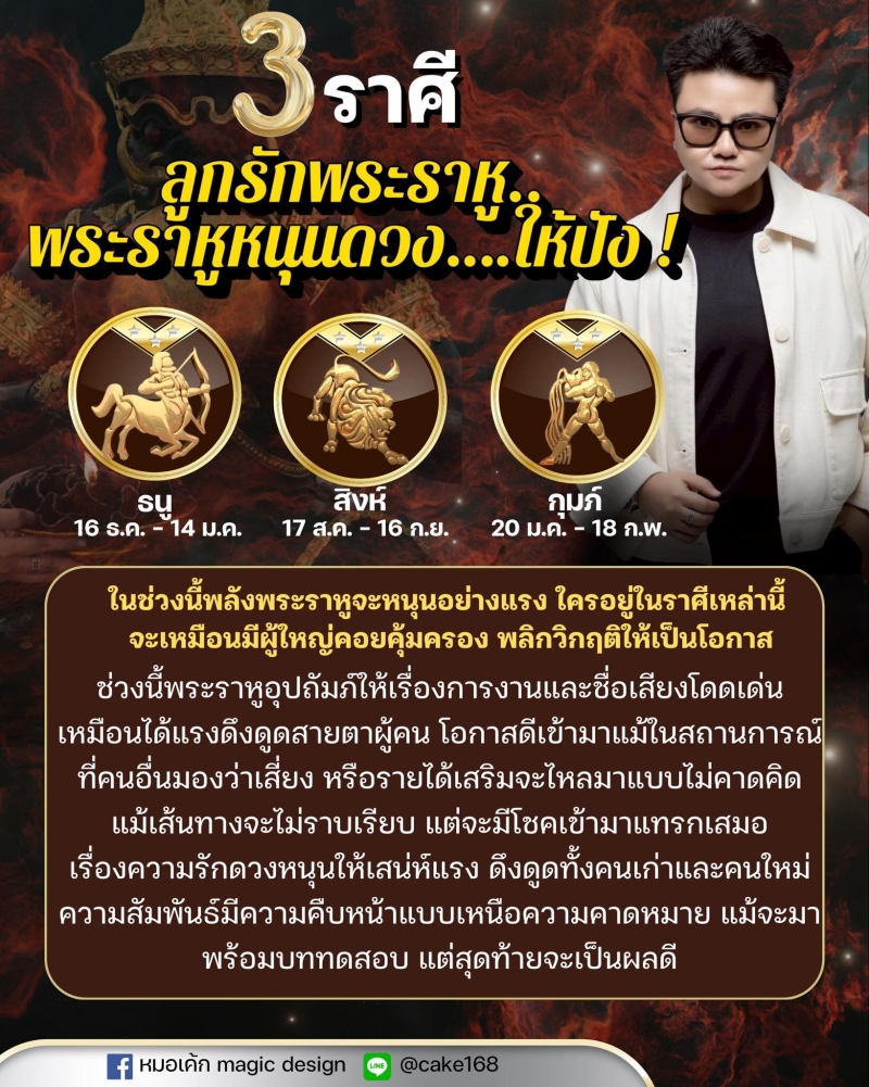 วันที่ 14 ส.ค. 68 ทาง หมอเค้กMagicdesign เผยถึงดวงชะตาราศี ลูกรักพระราหู พระราหูหนุนดวงให้ปัง ช่วงนี้พลังพระราหูจะหนุนอย่างแรง ใครอยู่ในราศีเหล่านี้จะเหมือนมีผู้ใหญ่คุ้มครอง พลิกวิกฤตให้เป็นโอกาส ช่วงนี้พระราหูอุปถัมภ์ให้เรื่องการงานและชื่อเสียงโดดเด่น เหมือนได้แรงดึงดูดสายตาผู้คน โอกาสดีเข้ามาแม้ในสถานการณ์ที่คนอื่นมองว่าเสี่ยง หรือรายได้เสริมจะไหลมาแบบไม่คาดคิด แม้เส้นทางจไม่ราบเรียบ แต่จะมีโชคเข้ามาแทรกเสมอ