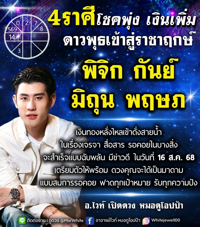 วันที่ 14 ส.ค. 68 ทาง อ.ไวท์ หมอดูโอปป้า ได้เผยถึง 4 ราศี โชคพุ่ง เงินเพิ่ม ดาวพุธเข้าสู่ราชาฤกษ์ เงินทองหลั่งไหลเข้าดั่งสายน้ำ ในเรื่องเจรจา สื่อสาร รอคอยในบางสิ่ง จะสำเร็จแบบฉับพลัน มีข่าวดีในวันที่ 16 ส.ค.68 เตรียมตัวให้พร้อม ดวงคุณจะได้เป็นมาดาม แบบสมการรอคอย ฟาดทุกเป้าหมาย รับทุกความปัง