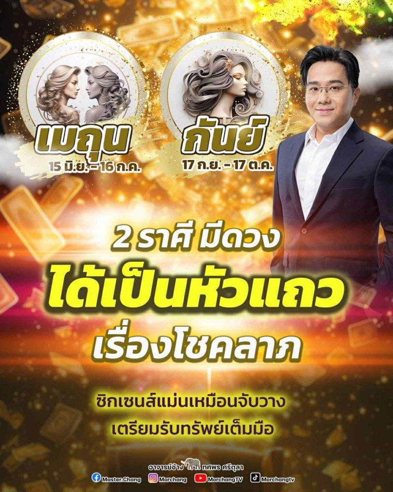 เรียกได้ว่า ในช่วงนี้ดวงของ 2 ราศี จะได้รับความโชคดีจากหลายด้าน เฉพาะเรื่องการเงิน และการลงทุน ที่มีโอกาสได้ผลตอบแทนที่คุ้มค่า หมอช้าง ทศพร ศรีตุลา ได้ออกมาทำนายผ่านเฟซบุ๊ก ถึง 2 ราศีที่ดวงโชคลาภเด่นที่สุด ได้แก่ ราศีเมถุน และ ราศีกันย์