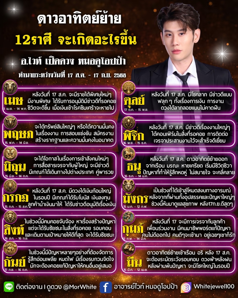 ดาวอาทิตย์ย้ายเข้าเรือนอริ หลัง 17 ส.ค. จะต้องระมัดระวังรอบคอบ ดวงฟ้าหลังฝน หลังผ่านพ้นปัญหาจะมีโชคใหญ่ในรอบปี