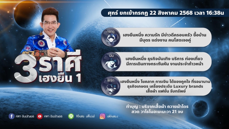 วันที่ 22 ส.ค. 2568 เพจเฟซบุ๊กชื่อ คฑา ชินบัญชร หรือที่เรารู้จักกันดีในนามหมอดูชื่อดังนั่นเอง โพสต์ข้อความถึง 3 ราศีรับความเฮงว่า ห้ามพลาด ดาวศุกร์ ยกเข้ากรกฎ 22 สิงหาคม 2568 เวลา 16:38 น. 3 ราศีเฮงยืนหนึ่ง รับดาวศุกร์ย้าย อย่าลืม สวด วาโธโนอะมะมะวา 21 จบด้วยกันนะครับ