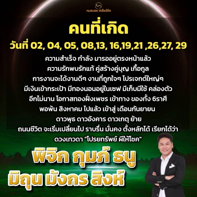 วันที่ 29 ส.ค. 68 ทาง หมอบอย เคลียร์ชัด ได้เปิด 6 ราศี คนที่เกิด วันที่ 02, 04, 05, 08,13,16,19,21,26,27,29 ความสําเร็จ กําลัง มารออยู่ตรงหน้าแล้ว ความรักพบรักแท้ คู่สร้างคู่บุญ เกื้อกูล การงานจะได้งานดีๆ งานที่ถูกใจๆ โปรเจกต์ใหญ่ๆ มีเงินเข้ากระเป๋า มีทองนอนอยู่ในเชฟ มีเก็บมีใช้ คล่องตัว อีกไม่นาน