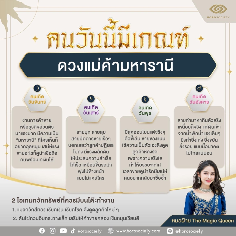 วันที่ 7 ก.ย. 68 เพจHorosociety เผย หมอฝ้ายTheMagicQueen เปิด 4 วันเกิด ดวงแม่ค้ามหารานี วันนี้แต่ละวันได้พลังแบบสุดปังเลยค่ะ ได้แก่
