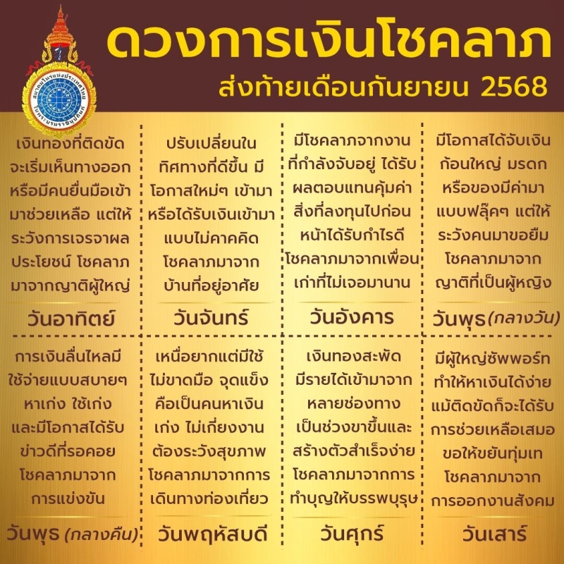 วันที่ 18 ก.ย. 68 สมาคมโหรแห่งประเทศไทย ในพระบรมราชินูปถัมภ์ เผยถึงดวงการเงิน โชคลาภส่งท้ายเดือนกันยายน 2568 จากเงินทองที่ติดขัด จะเริ่มเห็นทางออก หรือมีคนยื่นมือเข้ามาช่วยเหลือ