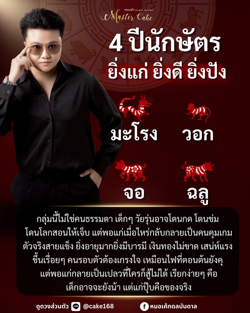 มะโรง วอก จอ ฉลู โดย 4 ปีนักษัตร ยิ่งแก่ ยิ่งดี ยิ่งปัง กลุ่มนี้ไม่ใช่คนธรรมดา เด็กๆ วัยรุ่นอาจโดนกด โดนข่ม โดนโลกสอนให้เจ็บ แต่พอแก่เมื่อไหร่ กลับกลายเป็นคนคุมเกม ตัวจริงสายแข็ง ยิ่งอายุมากยิ่งมีบารมี เงินทองไม่ขาด เสน่ห์แรงขึ้นเรื่อยๆ คนรอบตัวต้องเกรงใจ เหมือนไฟที่ตอนต้นยังคุ แต่พอแก่กลายเป็นเปลวที่ใครก็สู้ไม่ได้ เรียกง่ายๆ คือ เด็กอาจจะยังน้า แต่แก่ปุ๊บคือของจริง