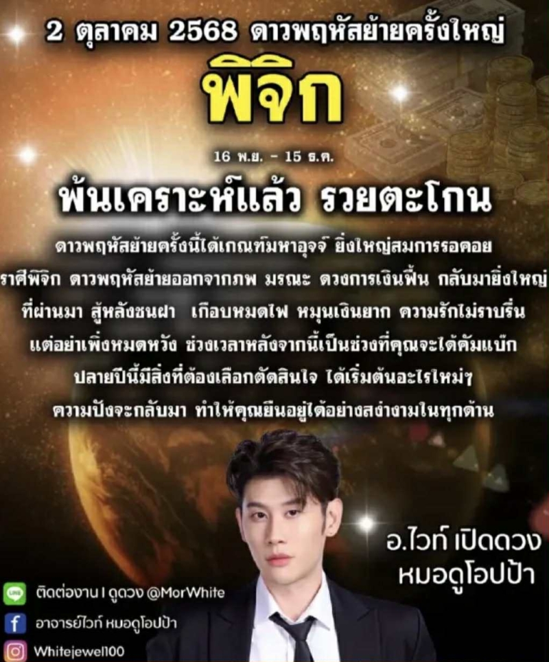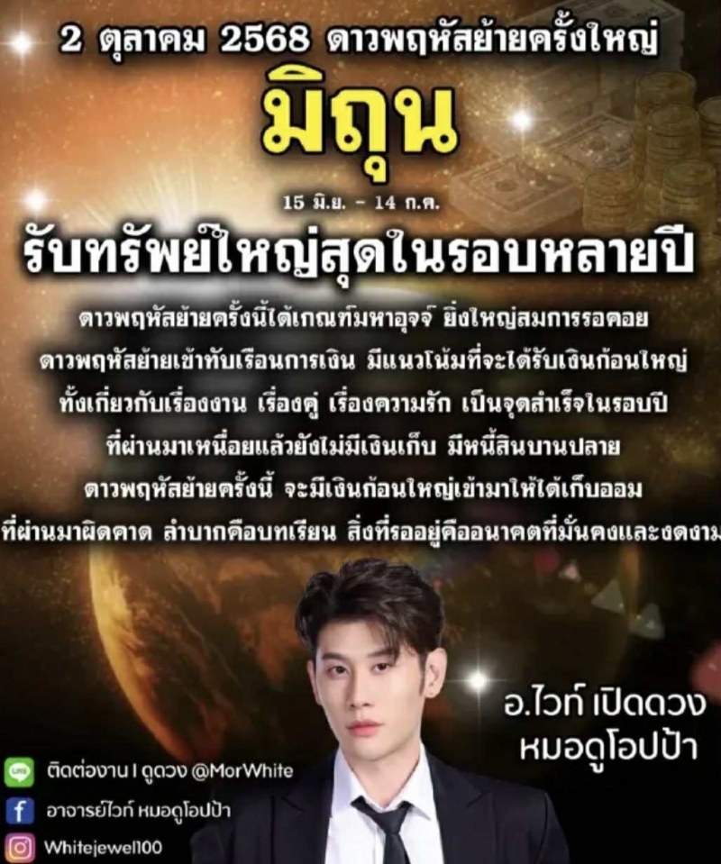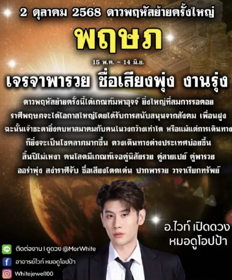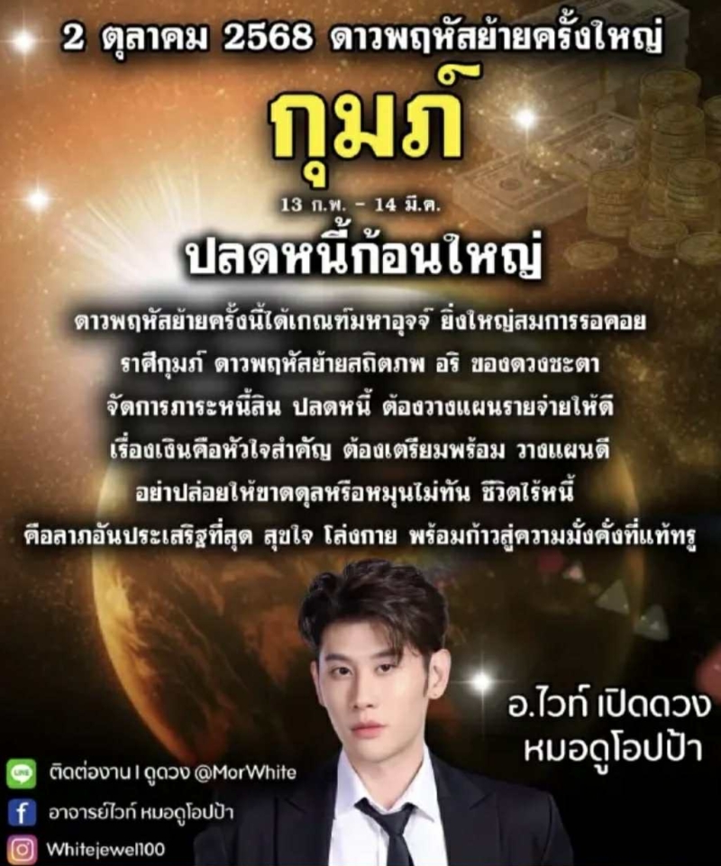 เรียกได้ว่า หลายคนคงรู้จัก กับ อ.ไวท์ หมอดูโอปป้า ออกมาเผยคำพยากรณ์ล่วงหน้า วันที่ 2 ตุลาคม 2568 ซึ่งตรงกับการเคลื่อนตำแหน่งของดาวพฤหัสบดี ถือเป็นจังหวะสำคัญ ที่ส่งผลต่อชีวิตผู้คน เฉพาะเรื่องการเงินที่จะเปิดทางกว้างให้กับบางราศี ผ่านเฟซบุ๊ก อ.ไวท์ หมอดูโอปป้า