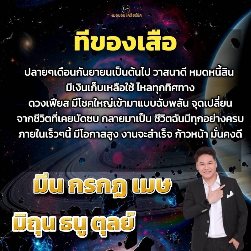 วันที่ 17 ก.ย 68 หมอบอย เคลียร์ชัด เผยถึงดวงชะตา 6 ราศี ทีของเสือ” ปลายเดือนกันยายนเป็นต้นไป วาสนาดี มีเงินเก็บเหลือใช้ ไหลทุกทิศทาง มีโชคใหญ่เข้ามาแบบฉับพลัน ประกอบด้วย ราศีมีน ราศีกรกฎ ราศีเมษ ราศีมิถุน ราศีธนู และ ราศีตุลย์ โดยมีรายละเอียดดังนี้