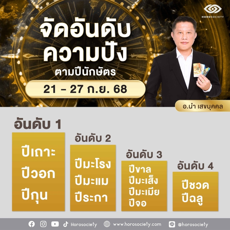 วันที่ 25 ก.ย. ทาง อ.นำ เสขบุคคล จัดอันดับความปังปีนักษัตร รายสัปดาห์ช่วงวันที่ 21-27 กันยายน 2568