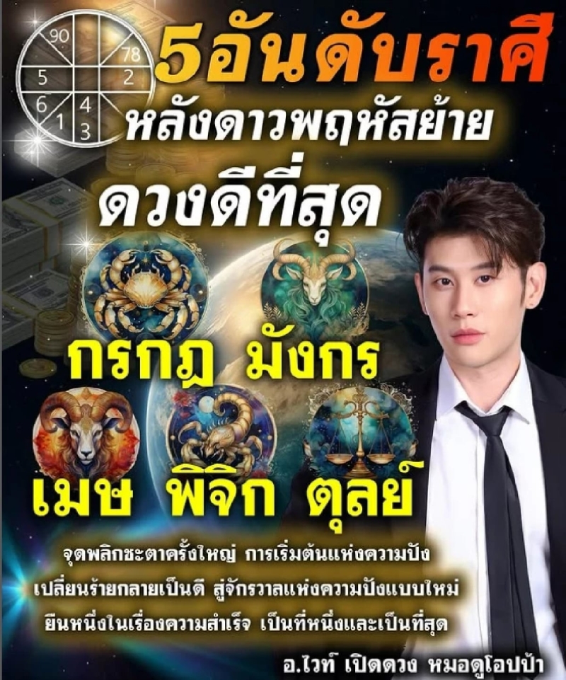 ซึ่ง 5 ราศี ที่ดวงดีจัดหนักในรอบนี้ ได้แก่ ราศีกรกฎ , ราศีมังกร , ราศีเมษ , ราศีพิจิก และราศีตุลย์ แต่ละราศีมีเกณฑ์รับข่าวดี ทั้งเรื่องเงินทอง ผลงานโดดเด่น และโอกาสขยายเครือข่ายใหม่ๆ ที่จะนำไปสู่การเติบโตในอนาคต