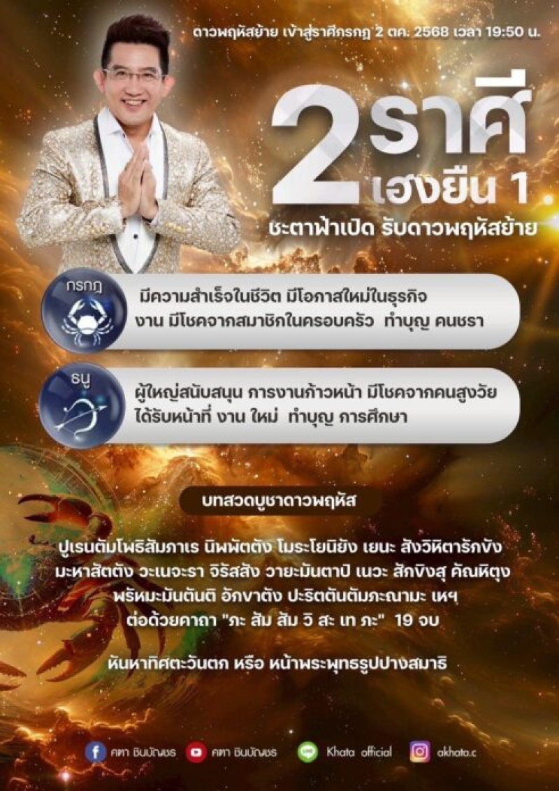 ก้าวเข้าสู่ช่วงท้ายปี เดือนกันยายนที่เต็มไปด้วยการเปลี่ยนแปลงทางดวงชะตา อ.คฑา ชินบัญชร หมอดูชื่อดัง เผยข่าวดีสำหรับ 2 ราศี ที่จะได้รับพลังงานบวกแบบเต็มๆ จากการโคจรย้ายของ ดาวพฤหัสบดี ซึ่งจะย้ายเข้าสู่ราศีกรกฎในวันที่ 2 ตุลาคม 2568 เวลา 19:50 น. ส่งผลให้ดวงชะตาเปลี่ยนแปลงไปในทางที่ดีมาก เป็นจังหวะที่ ฟ้าเปิด หนุนให้ประสบความสำเร็จและมีโอกาสใหม่ๆ เข้ามาในชีวิต