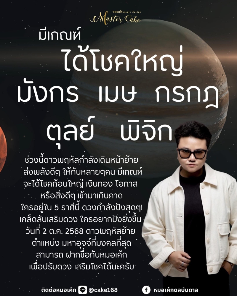 วันที่ 2 ต.ค. 68 หมอเค้กดลบันดาล เผยถึงดวงชะตาราศี มีเกณฑ์ได้โชคใหญ่ ช่วงนี้ดาวพฤหัสกำลังเดินหน้าย้าย ส่งพลังดีๆ ให้กับหลายๆ คน มีเกณฑ์จะได้โชคก้อนใหญ่ เงินทอง โอกาสหรือสิ่งดีๆ เข้ามาเกินคาด ใครอยู่ราศีนี้ดวงกำลังปังสุดๆ เคล็ดลับเสริมดวง ใครอยากปังยิ่งขึ้น วันที่ 2 ต.ค. ดาวพฤหัสย้าย ตำแหน่งมหาอุจจ์ที่มงคลสุด สามารถทำได้