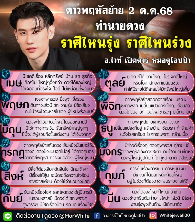 วันที่ 3 ต.ค. อ.ไวท์ เปิดดวง หมอดูโอปป้า เผยถึงดวงราศี หลังดาวพฤหัสย้าย 2 ต.ค.2568 ทำนายดวง ราศีไหนรุ่ง ราศีไหนร่วง