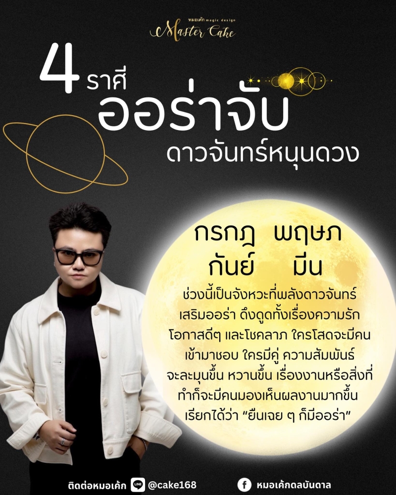 วันที่ 6 ต.ค. หมอเค้กดลบันดาล เผยถึง 4 ราศี ที่ออร่าจับ ดาวจันทร์หนุนดวง ใครอยู่ใน 4 ราศีนี้ช่วงนี้คือ สวย หล่อ ดูดีขึ้น ไปไหนก็มีแต่คนเหลียวมอง ช่วงนี้เป็นจังหวะที่พลังดาวจันทร์ เสริมออร่า ดึงดูดทั้งเรื่องความรัก โอกาสดีๆ และโชคลาภ ใครโสดจะมีคน เข้ามาชอบ ใครมีคู่ ความสัมพันธ์จะละมุนขึ้น หวานขึ้น เรื่องงานหรือสิ่งที่ ทำก็จะมีคนมองเห็นผลงานมากขึ้น เรียกได้ว่า “ยืนเฉยๆ ก็มีออร่า”