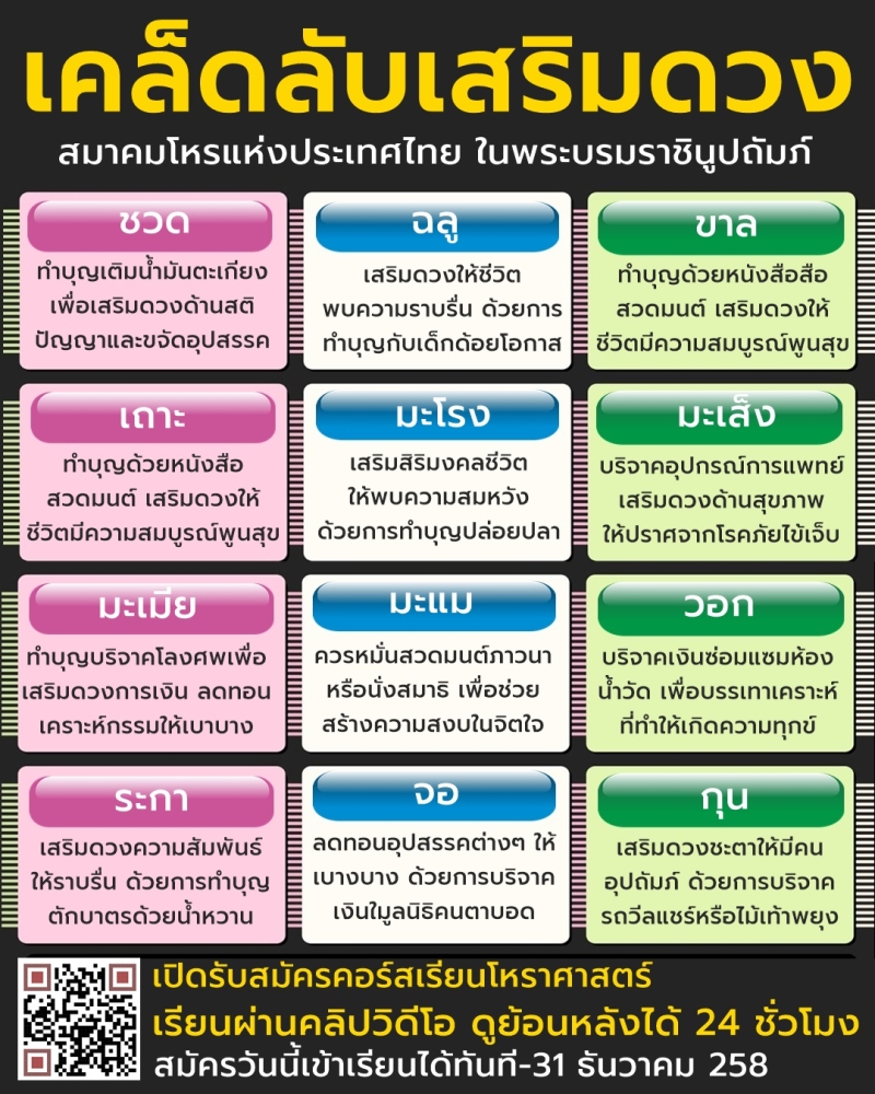 โดย สมาคมโหรแห่งประเทศไทย ในพระบรมราชินูปถัมภ์ ออกมาเผยวิธีเสริมดวง 12 นักษัตร
