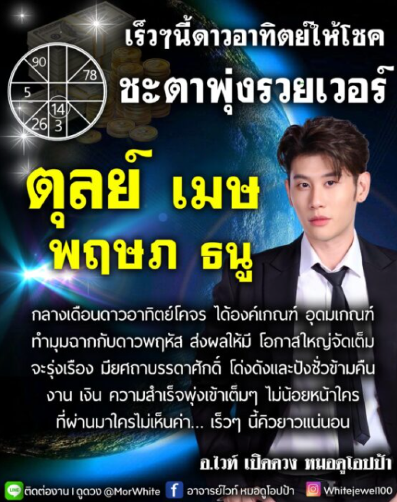 โดย อาจารย์ไวท์ หมอดูโอปป้า เผยว่า ดาวอาทิตย์กำลังส่งพลังหนุนอย่างเต็มที่ ในกลางเดือนตุลาคม ดาวอาทิตย์โคจรเข้าสู่ตำแหน่งสำคัญ ทำมุมสัมพันธ์กับดาวพฤหัส ส่งผลให้ผู้ที่อยู่ในราศี ได้รับอิทธิพล มีโอกาสสร้างความก้าวหน้า มีชื่อเสียง และประสบความสำเร็จอย่างรวดเร็ว
